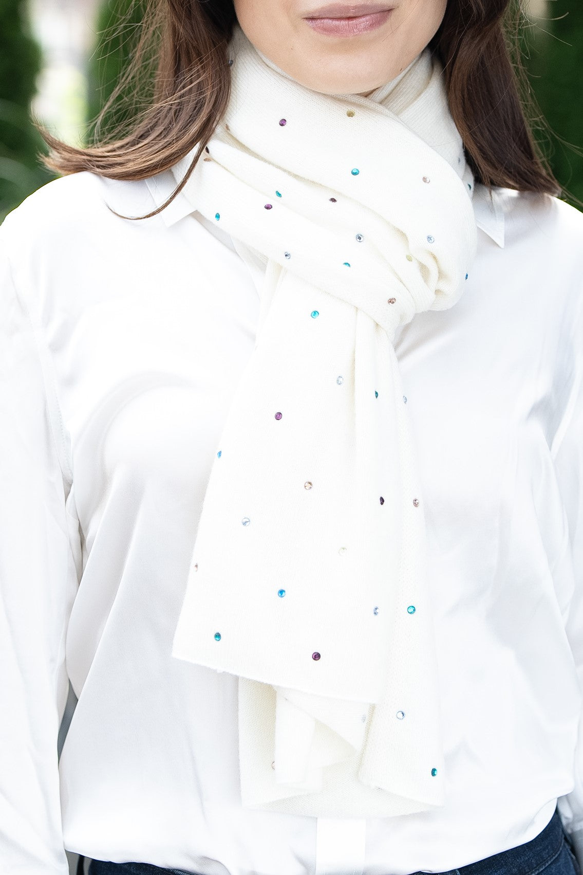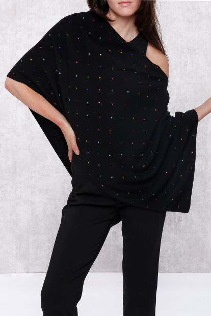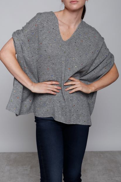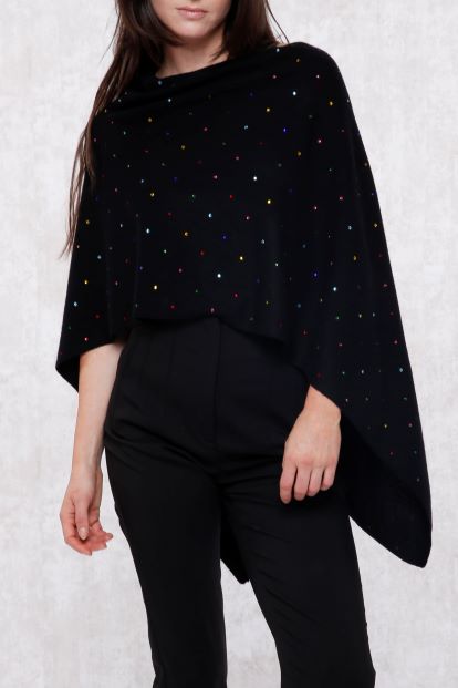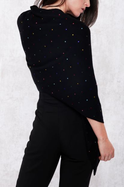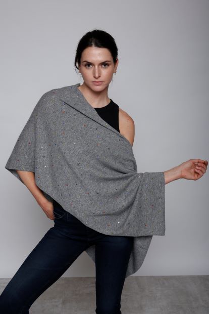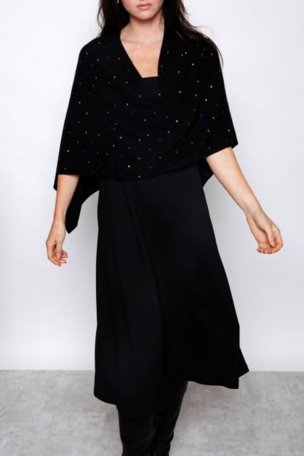 This 70% wool 30% cashmere topper with allover crystal beads will add a little shine for day to evening dressing.