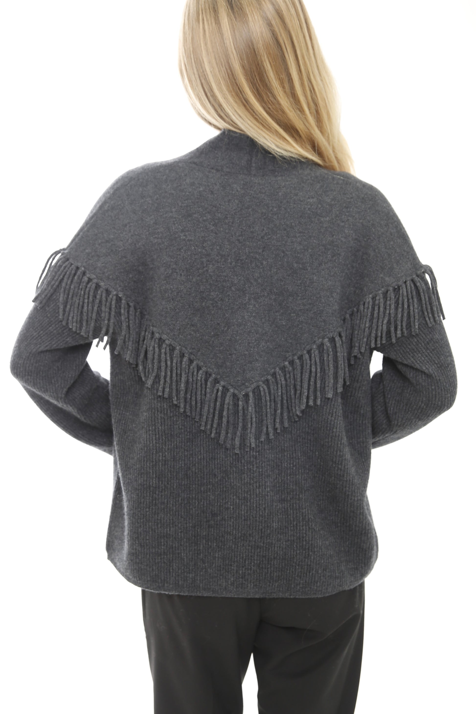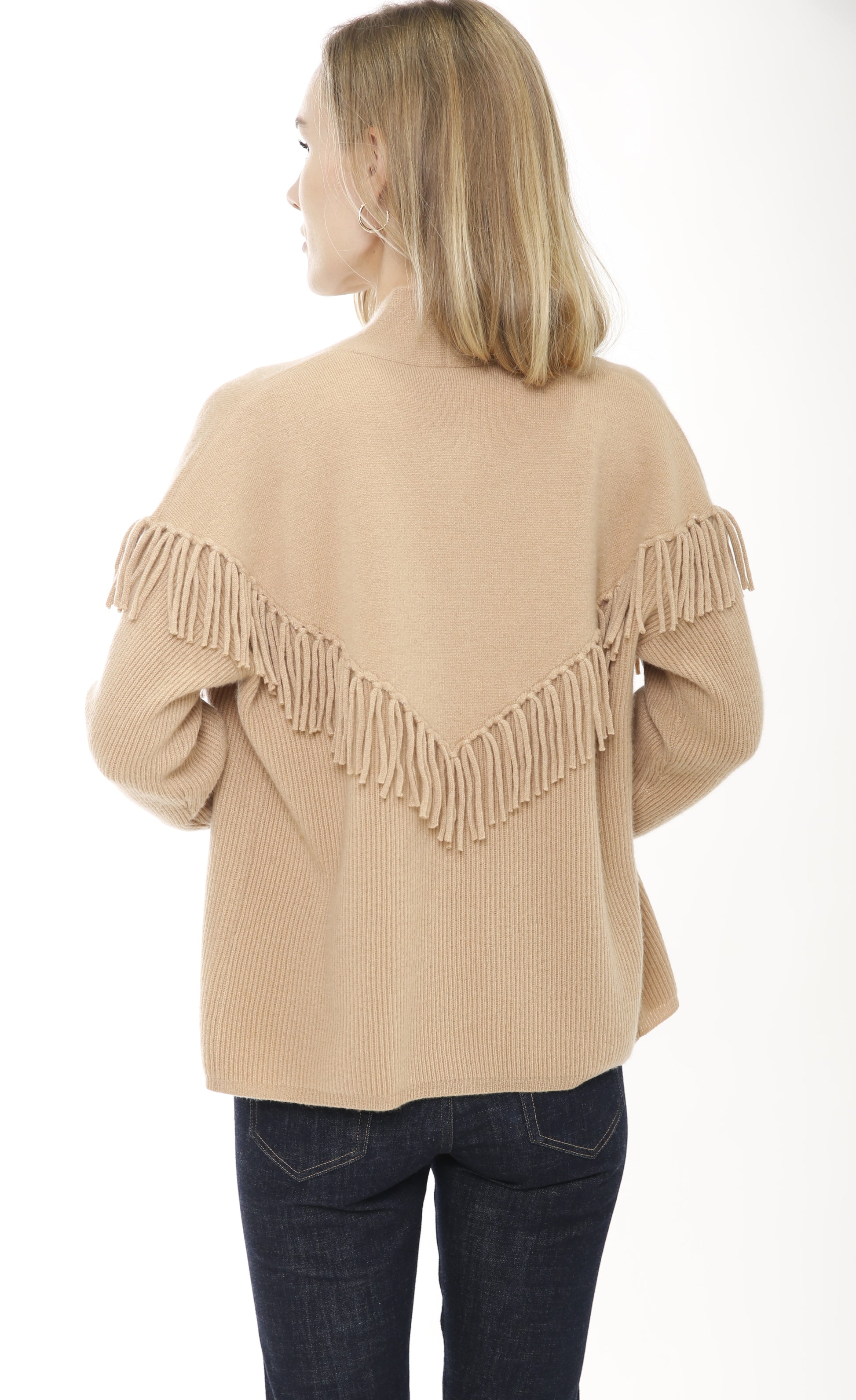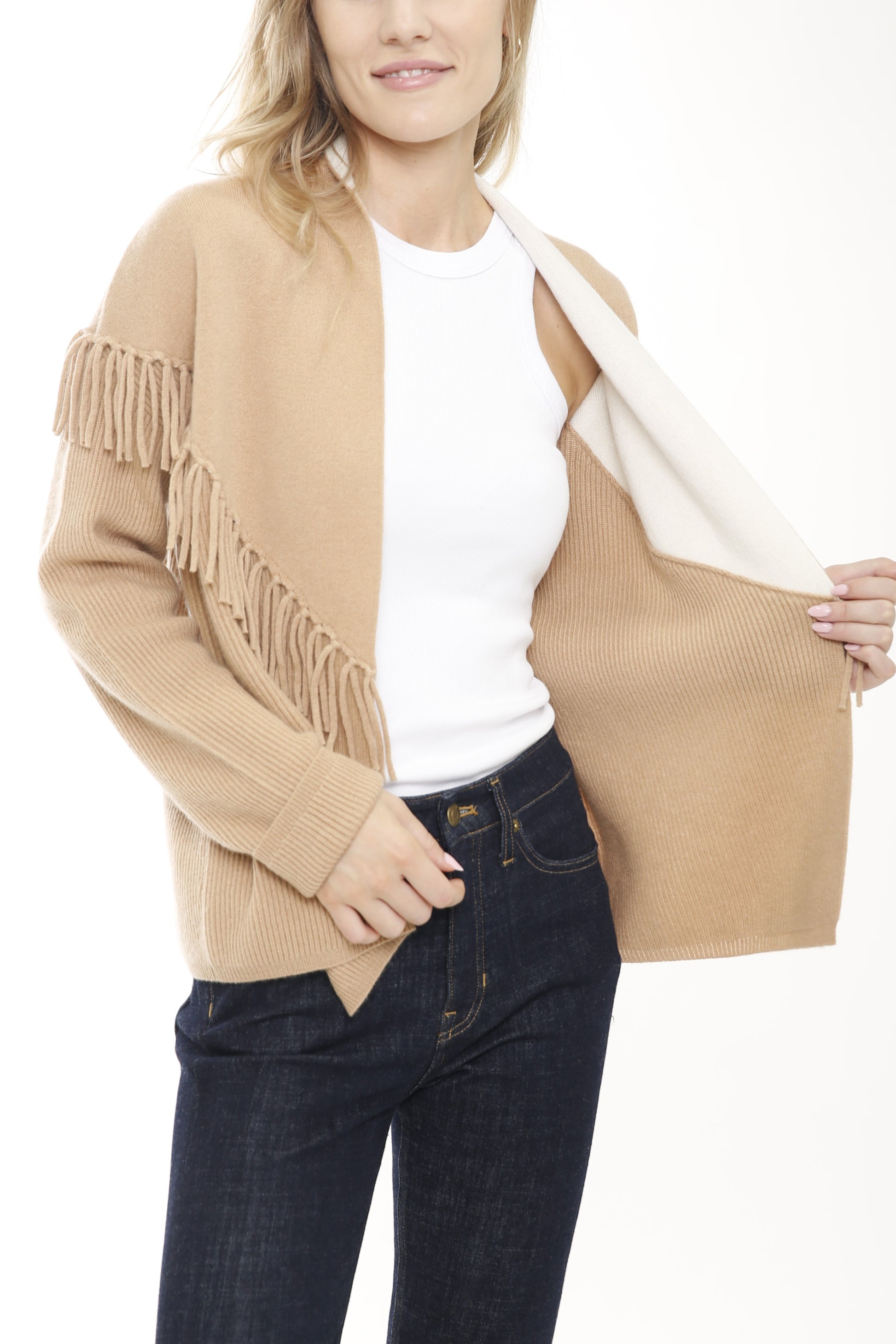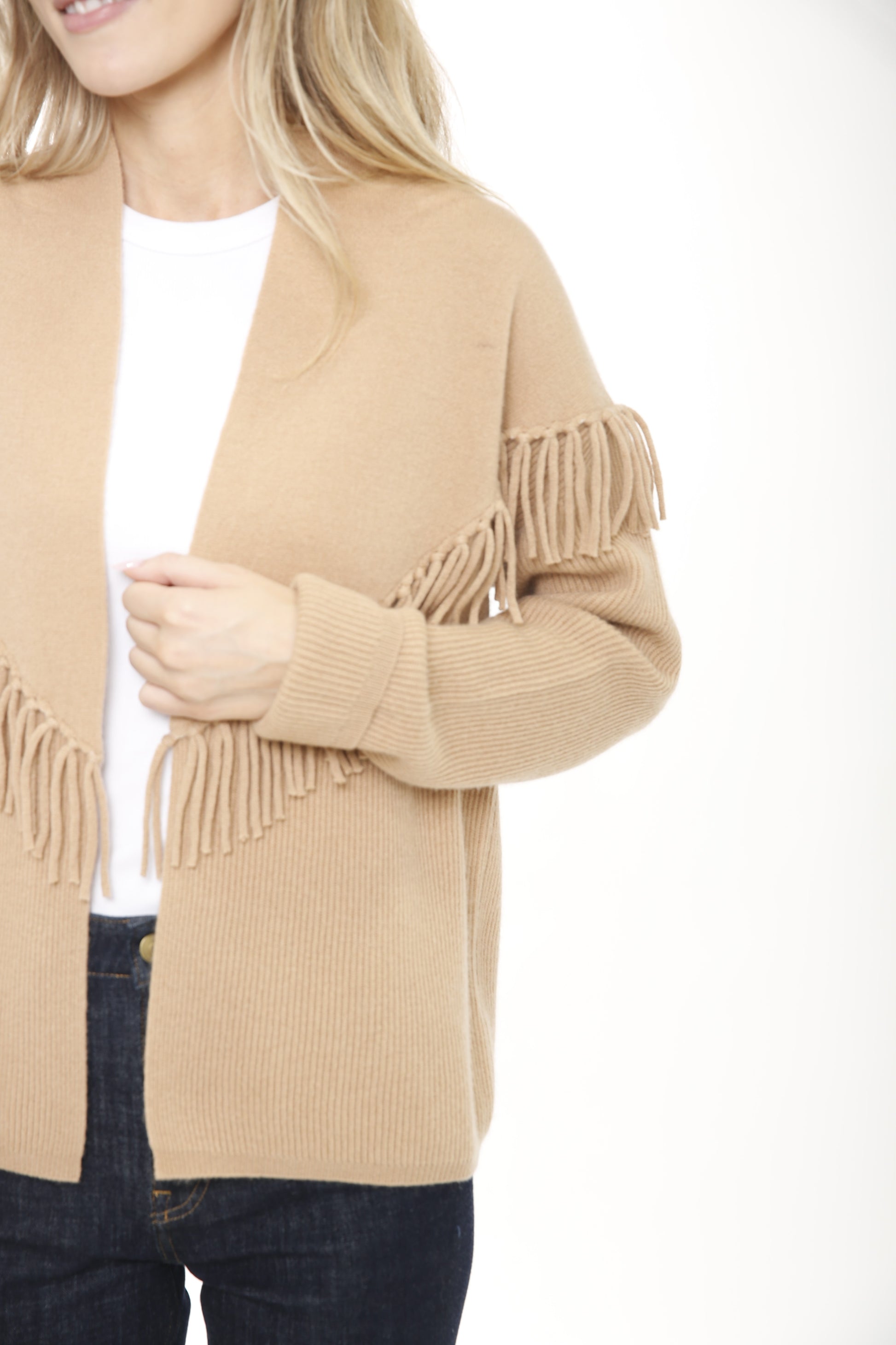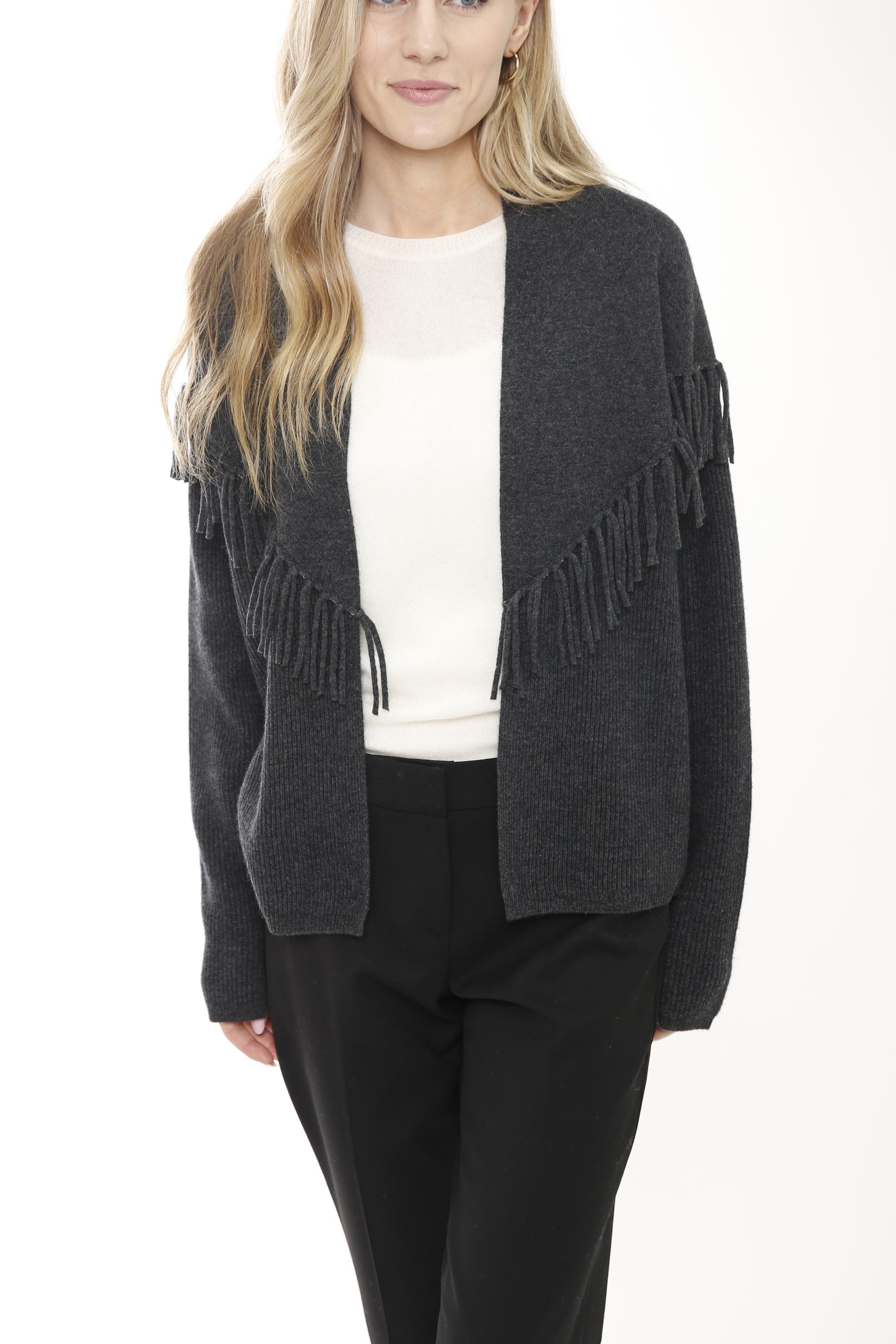 The combination of the open cardigan V-neck fringe yoke, makes this cardigan a statement piece that brings comfort and creativity.