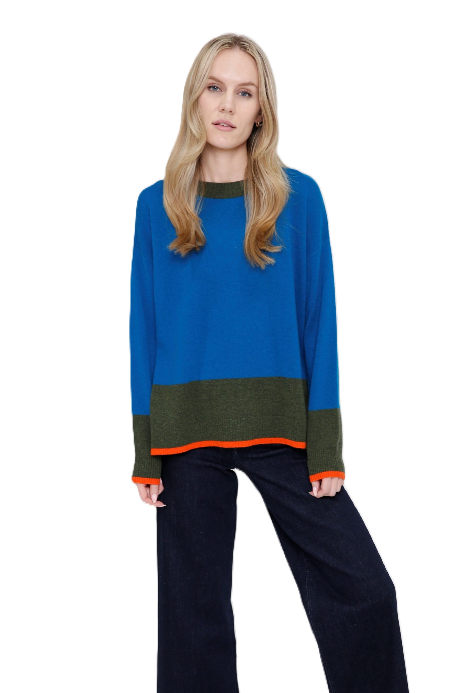 100% Cashmere color block long sleeve sweater combines the luxurious softness of cashmere with a stylish, modern edge.
