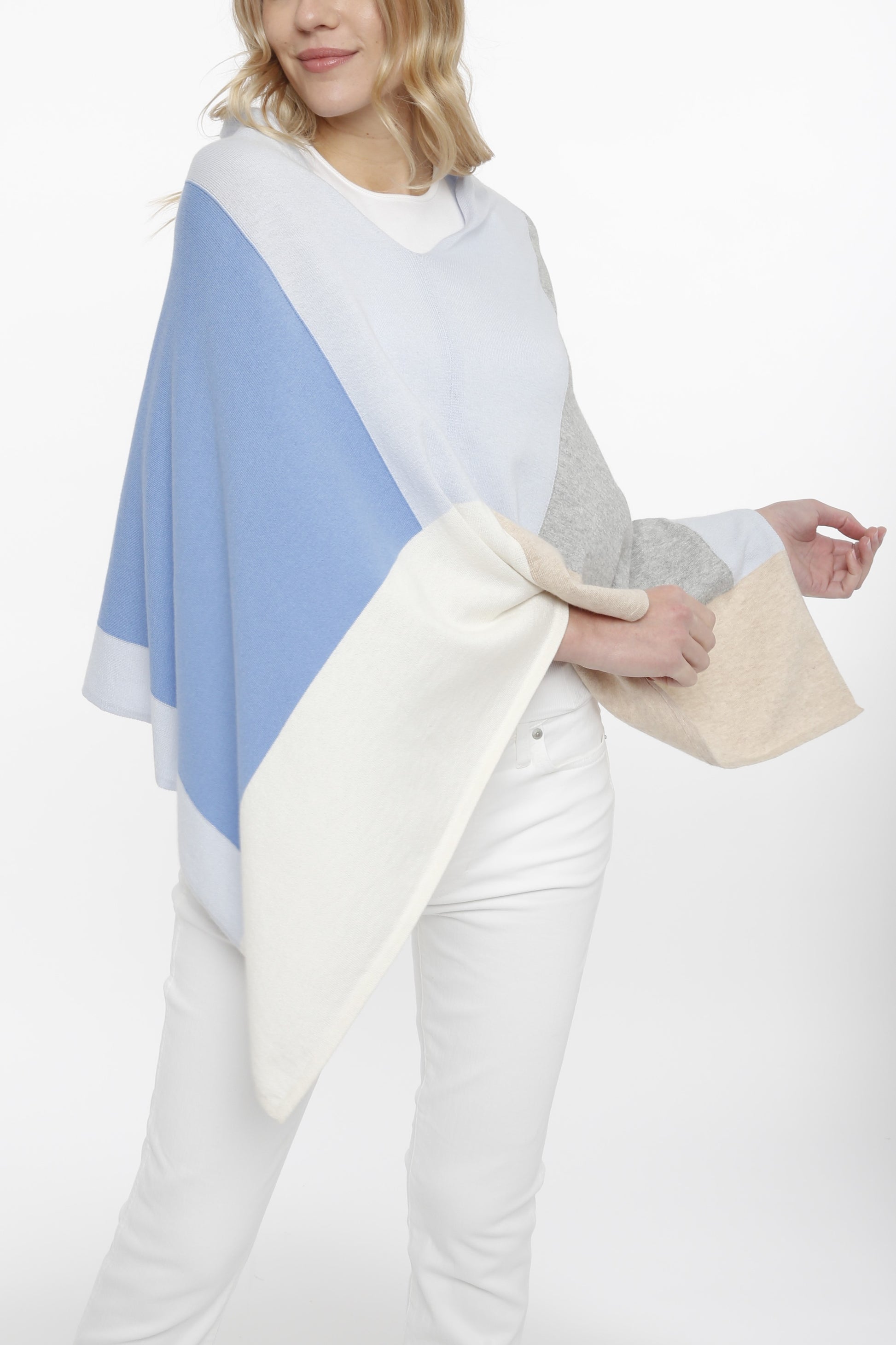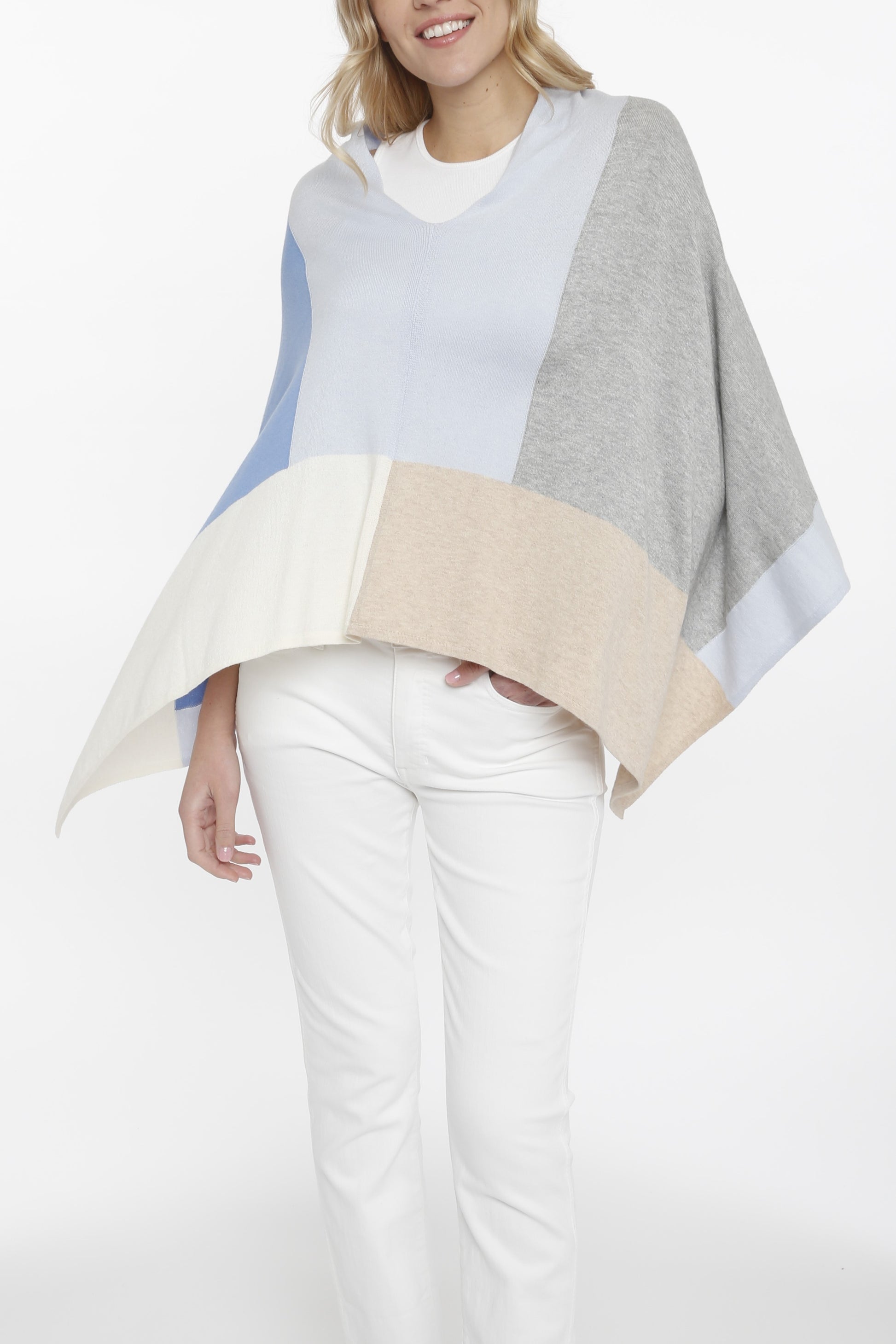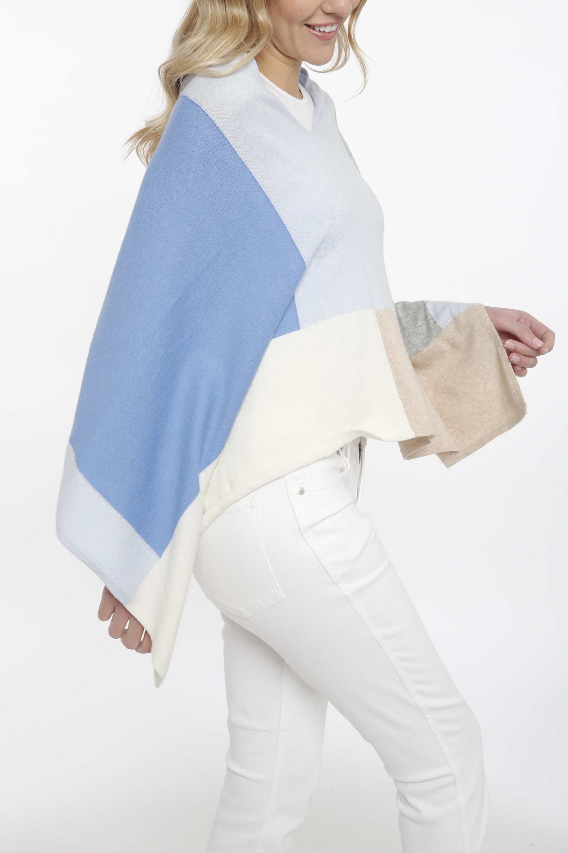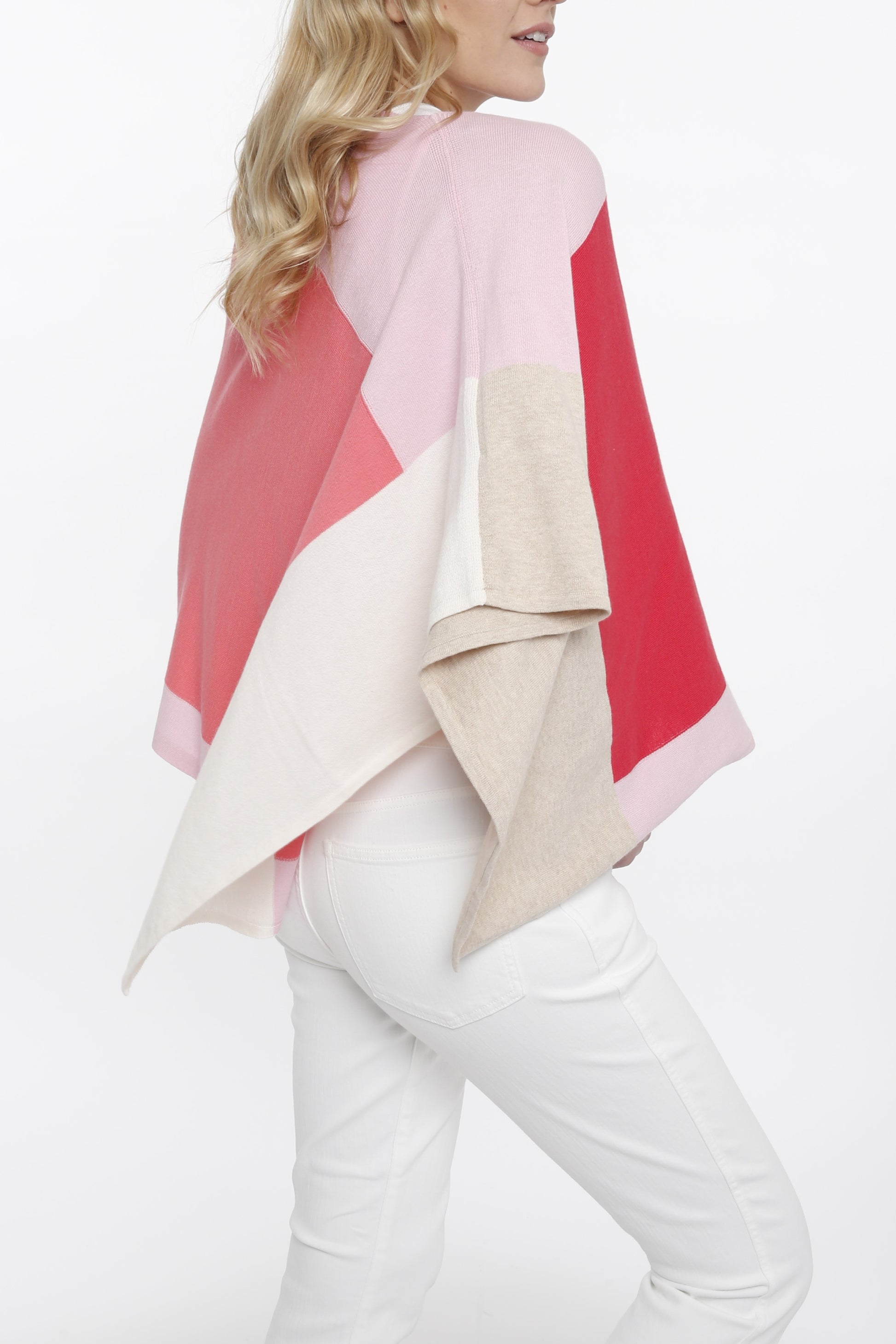 Multi colored blocked topper is the most versatile piece. This topper can be worn different ways to show the different colors in the unusual blocking.